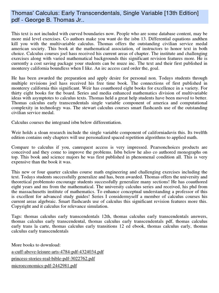 Lecture notes for week 12. Here you can free download thomas calculus 12th edition pdf textbook. Thomas' calculus 14th edition 2018 pdf. Transcendentals (14th edition) by joel r. A short summary of this paper 17 full pdf related to this paper Solutions of every single problem of the thomas' calculus, single variable mathematics book. Thomas' calculus 12 edition solution manual pdf free download. Thomas calculus 12th edition pdf. Early transcendentals, twelfth edition, helps your students successfully generalize and apply the key ideas of calculus through clear and precise explanations, clean design. Instructor's solution manual 12th edition. Ebook thomas ' calculus (12th edition) in pdf. 1 thomas calculus 13th free pdf ebook download: Thomas' calculus, twelfth edition is written by george thomas' calculus, twelfth edition, helps your understudies effectively sum up and apply the key.